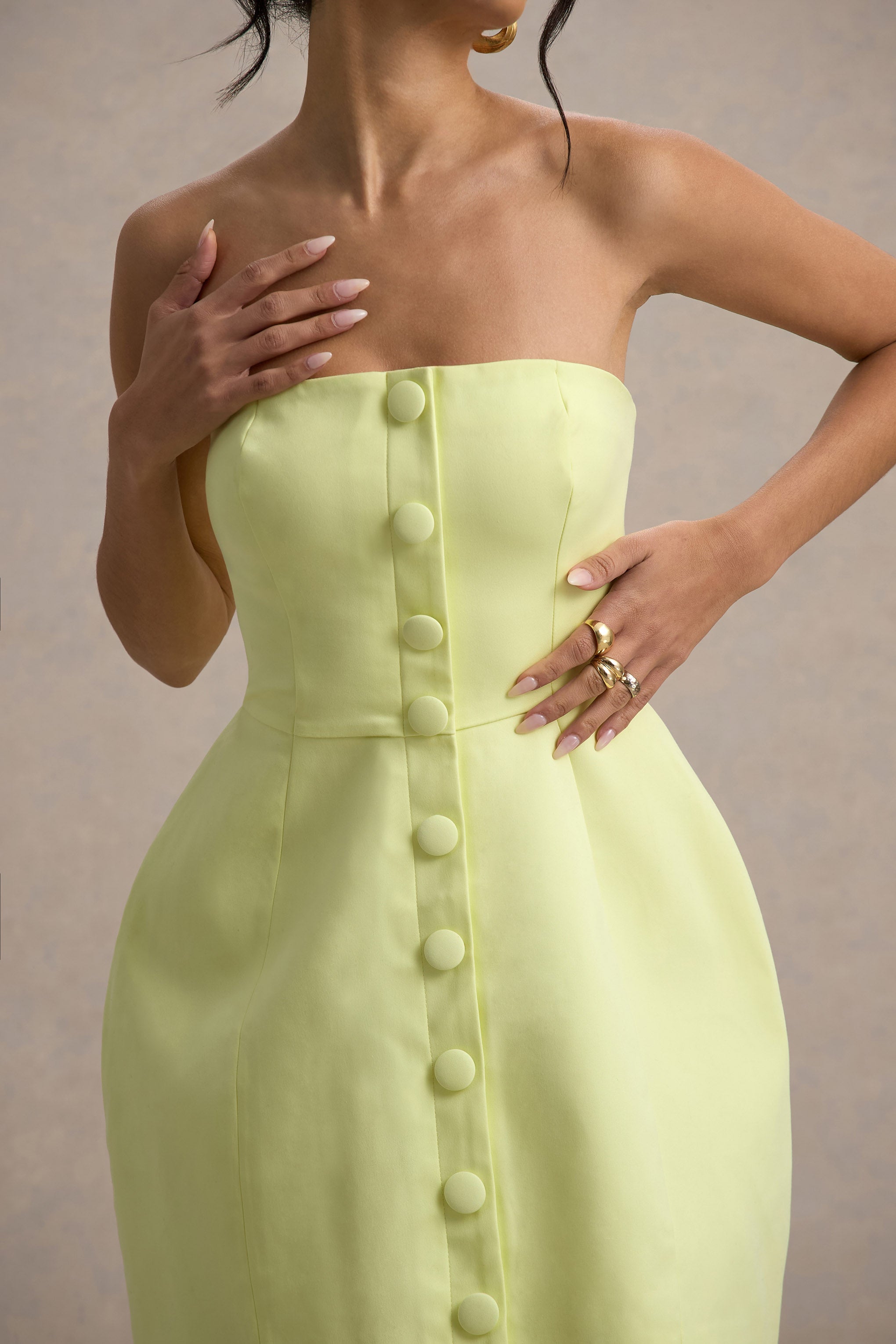 A capsule wardrobe must-have is Anniston. This staple lemon mini dress has been crafted in a premium cotton modal. and boasts a timeless tailored silhouette. Detailed by a bandeau neckline and a buttoned bodice this mini couldn't be any more perfect.
