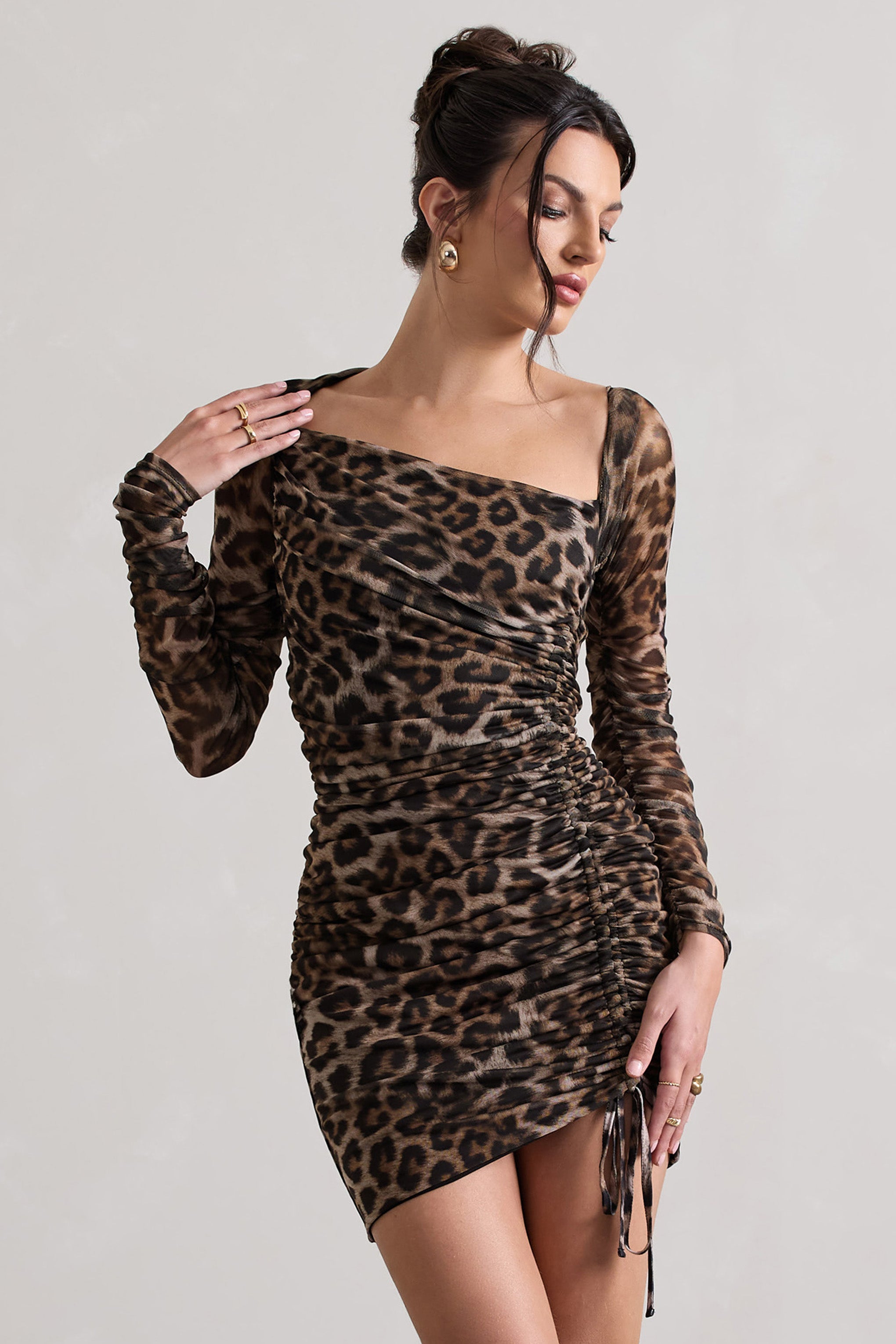 Wrap your curves in this Grecian mini dress made from Club L's signature stretch jersey and a layer of sheer ruched mesh. Named after the goddess of beauty. Aphrodite arrives in an asymmetric silhouette with one exposed shoulder. long sleeves and a drawstring-adjusted hemline. Make this printed mini party-appropriate with gold hoop earrings and strappy stilettos.