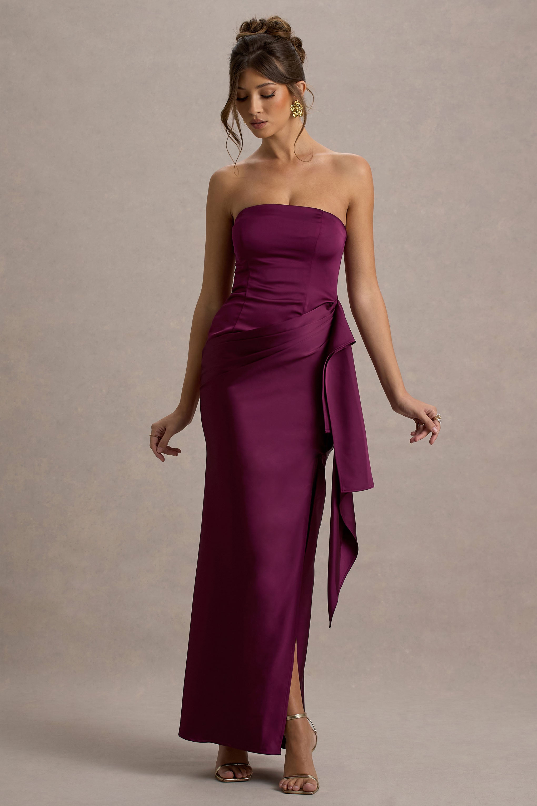 Defined by soft elegance and refined detail. Loz is a stunning choice for your most glamorous occasions. Crafted from our luxurious premium stretch satin in a burgundy hue. this maxi dress features a chic bandeau neckline that beautifully highlights the shoulders. The expertly draped silhouette flatters the figure. while the floor-length skirt adds a touch of timeless sophistication. Trying styling Loz with sparkling accessories for a look that exudes romantic charm.