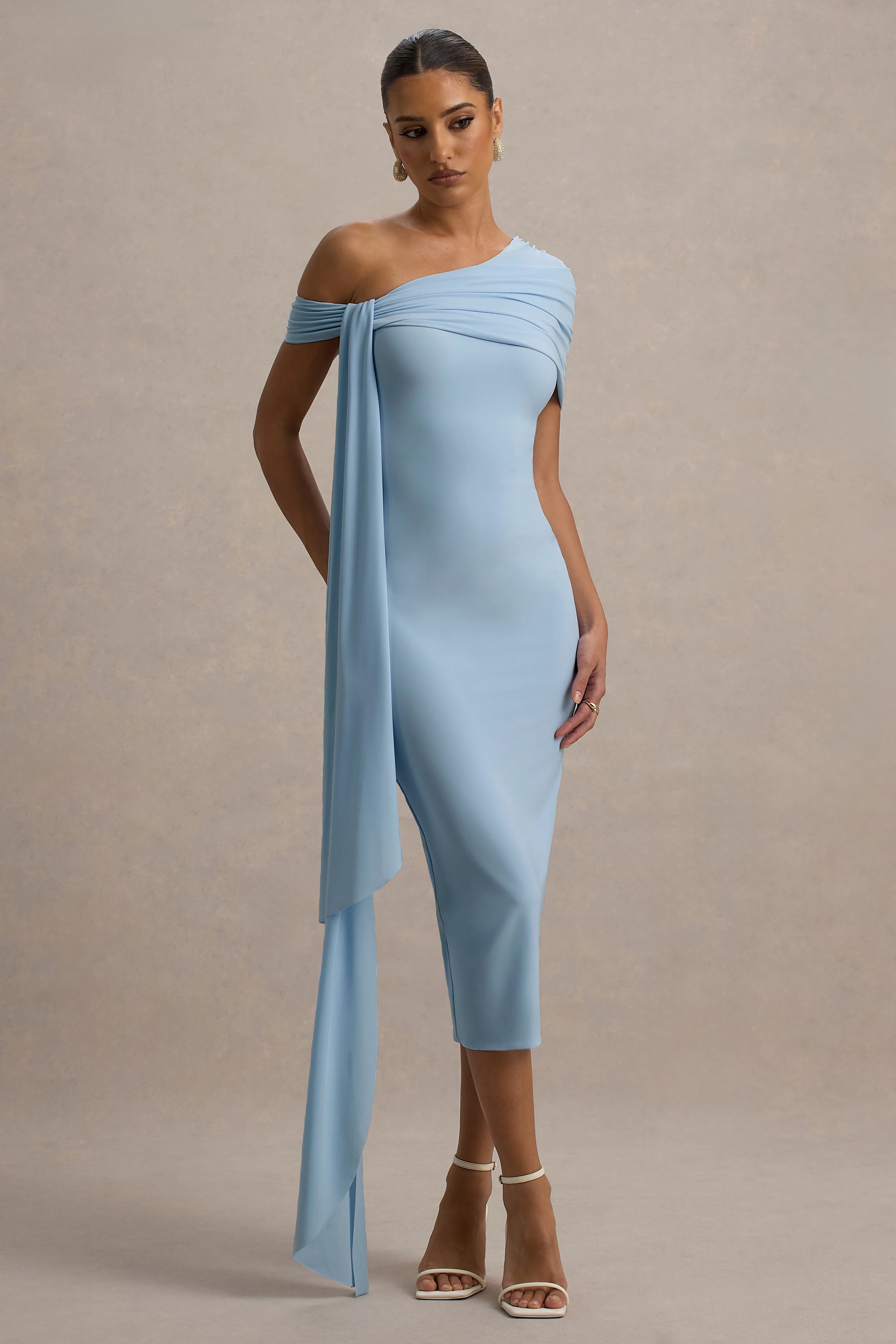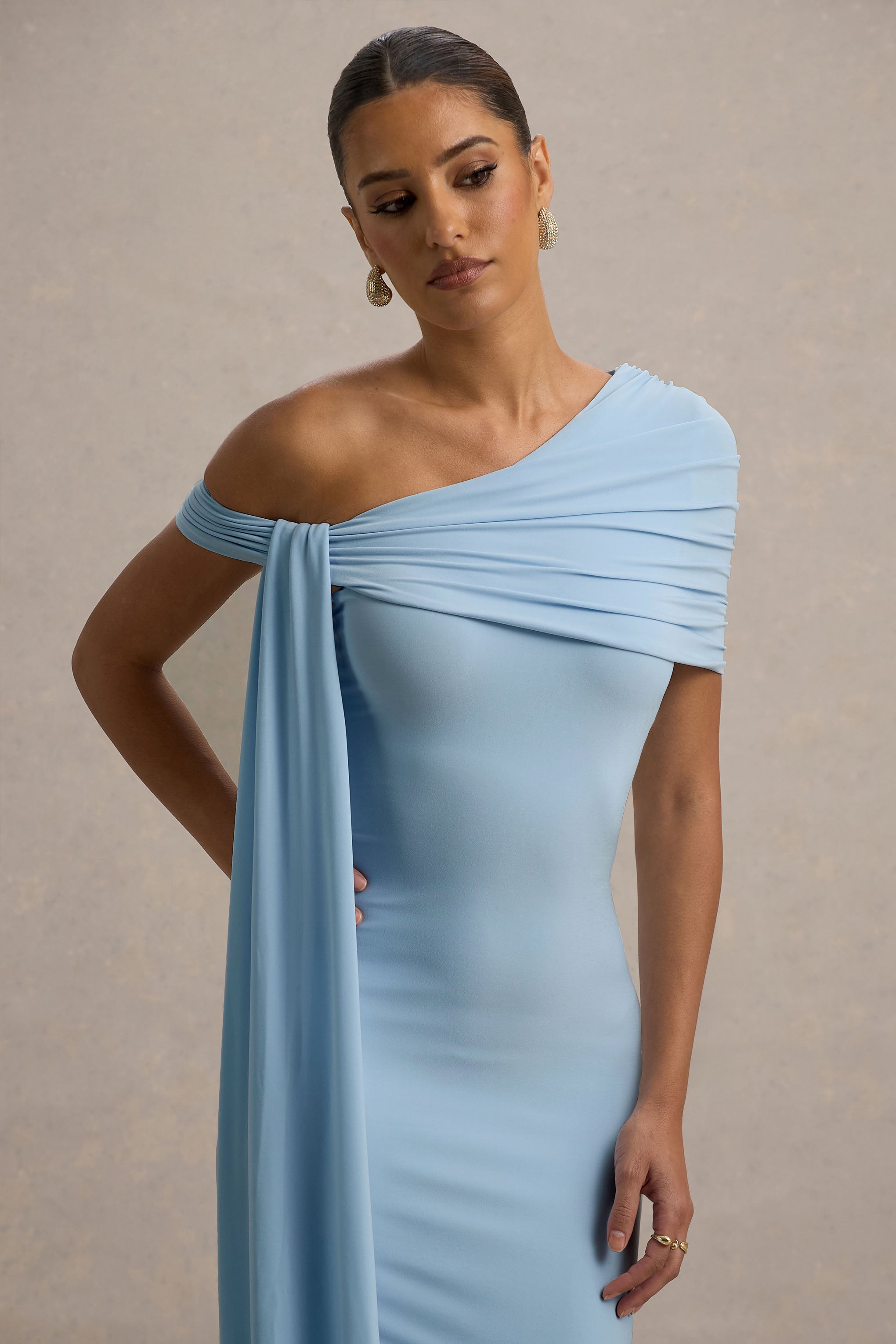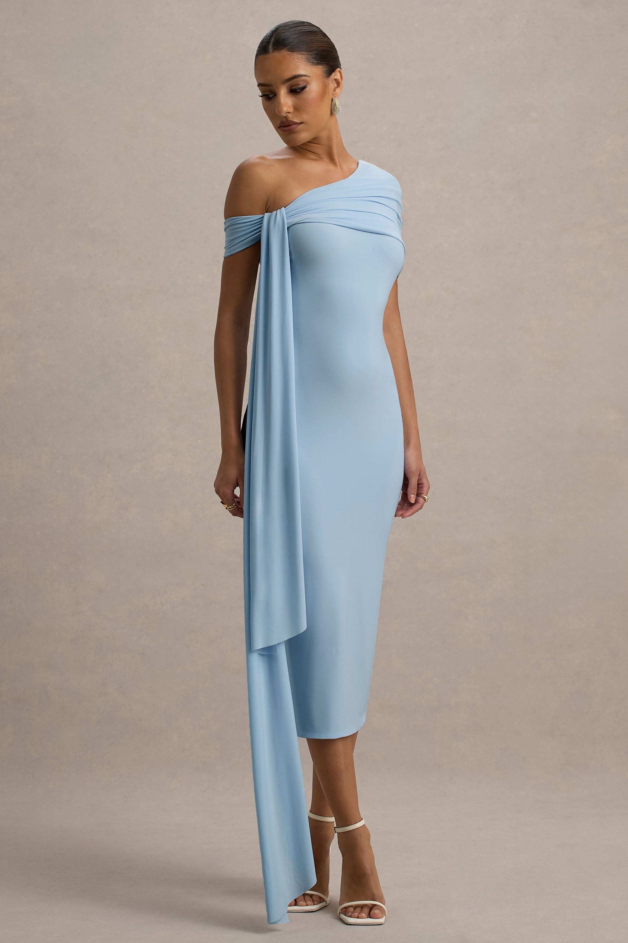 Curate a timeless collection of midi dresses starting with Vallea. our stand-out staple. Arriving in a soft blue shade of our dual-layered jersey. this form-flattering piece boasts an asymmetric neckline. long drape detail and functional split hemline for ease of movement. For a stunning summer wedding ensemble. compliment Vallea with an elegant updo and some shimmering accents.